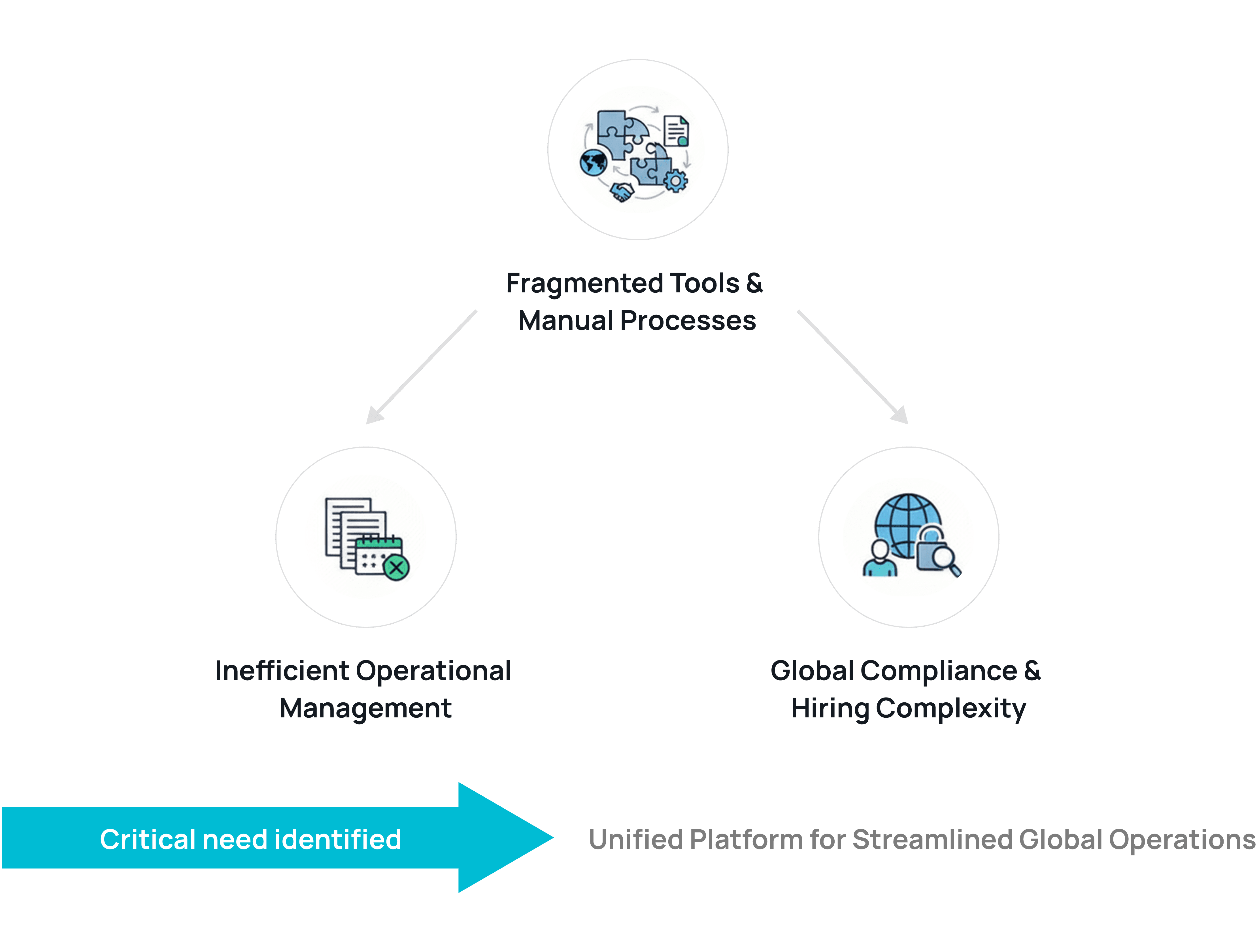 Companies were forced to use a disjointed array of separate tools (e.g., email, spreadsheets, various HR apps) for global hiring, payroll, project management, and compliance. This reliance on manual coordination created significant friction.